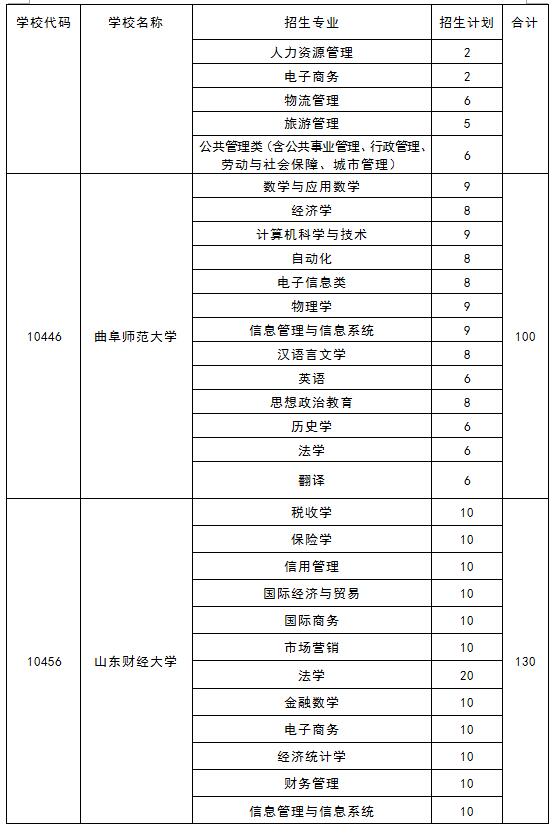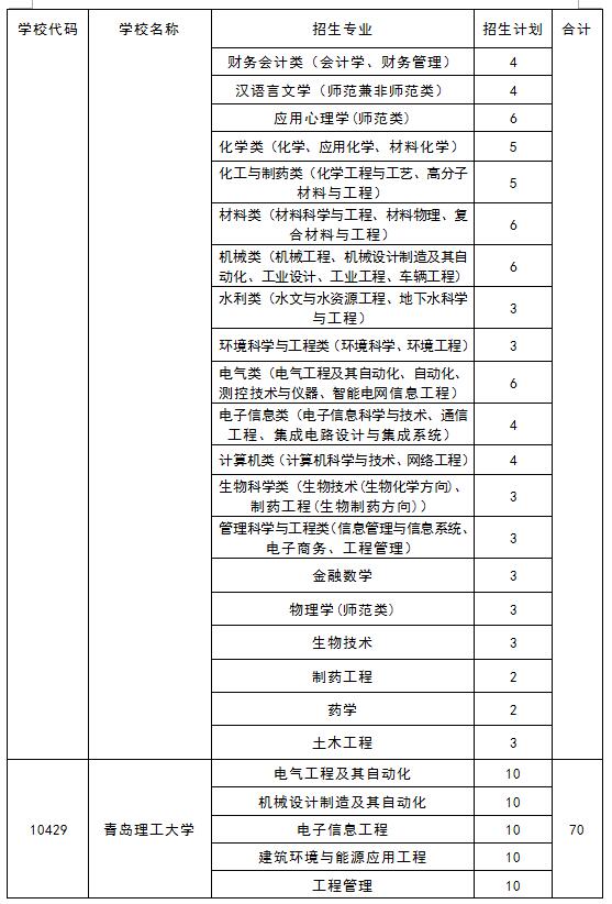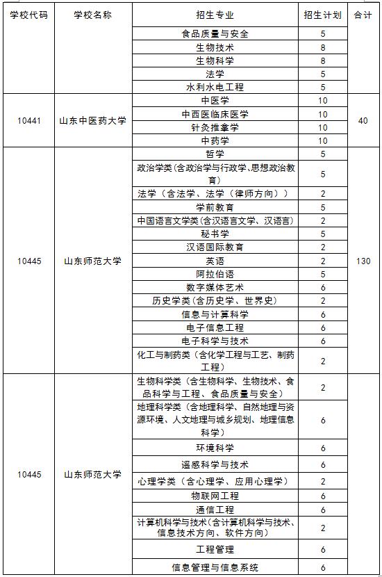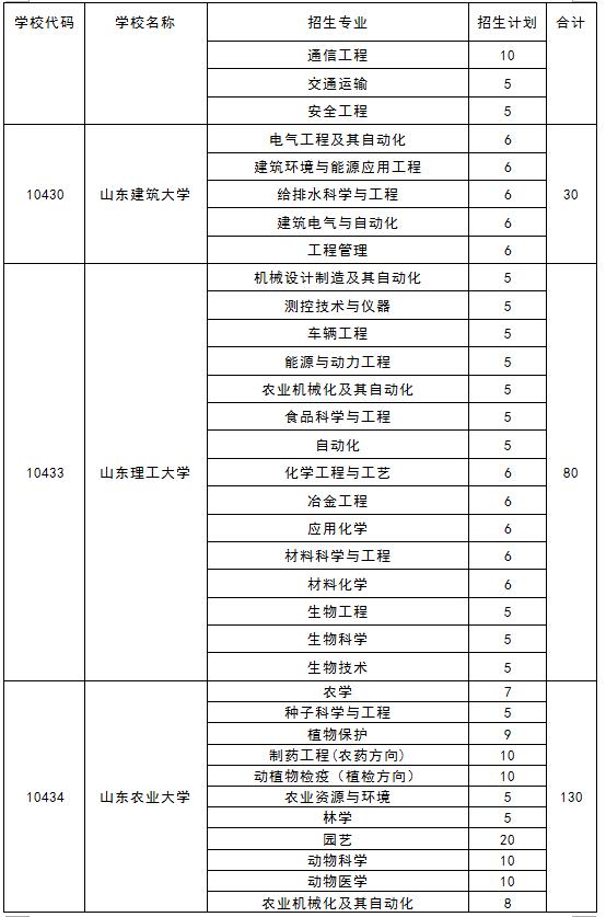 农村专项计划的招生学校为列入我省本科一批招生的省属高校,包括山东科技大学、青岛科技大学、济南大学、青岛理工大学、山东建筑大学、山东理工大学、山东农业大学、山东中医药大学、山东师范大学、曲阜师范大学、山东财经大学、青岛大学等12所高校。招生专业以农林、水利、地矿、机械、师范、医学以及其他适农涉农等贫困地区急需专业为主。
