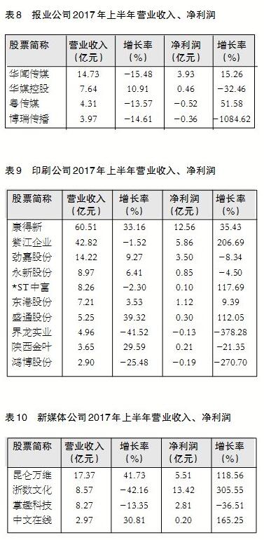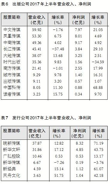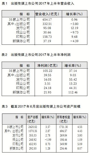 根据上市公司2017年半年度报告,对内地主板和创业板上市的35家出版传媒企业(出版公司11家、发行公司6家、报业公司4家、印刷公司10家、新媒体公司4家)经营情况分析如下。