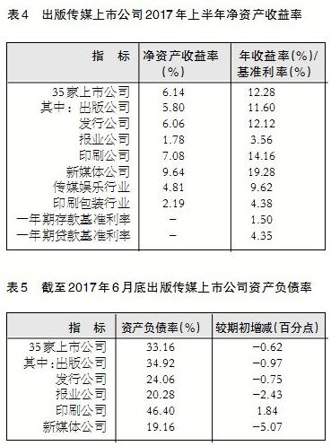 2017年上半年,出版传媒上市公司净资产收益率为6.14%(较上年同期提升0.71个百分点),高于传媒娱乐行业4.81%(数据来源:新浪财经)和印刷包装行业2.19%(数据来源:新浪财经)的平均水平。换算成年收益率为12.28%,远高于报告期末一年期存款基准利率(1.50%)和贷款基准利率(4.35%),显示出出版传媒上市公司整体具有较强的盈利能力。