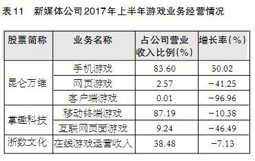 各公司游戏业务呈现逐步由页面游戏、客户端游戏向手机游戏转移的趋势。报告期内,昆仑万维全面压减了页面游戏和客户端游戏的收入规模,公司业务进一步向手机游戏集中,手机游戏的占比已经达到了83.60%。掌趣科技互联网业务游戏(-46.49%)的降幅远高于移动终端游戏(-10.38%),移动终端游戏收入的占比提升至87.19%,2017年5月、6月新上线的游戏《神话永恒》《魔法门之英雄无敌:战争纪元》均为手机游戏。浙数文化在保持PC棋牌业务稳定发展的基础上,全力拓展移动端市场。报告期内,旗下杭州边锋在浙江省内推出了《杭麻圈》《丽水茶苑》等10余款地方性的移动端棋牌游戏,并通过投资乐玩、收购深圳天天爱科技,布局全国市场。(详见表11)